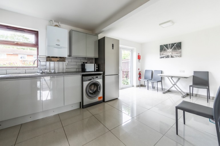 The property comprises entrance hallway leading to front-facing double bedroom, spacious open-plan living/dining area with views of the garden. The kitchen is fitted with oven/hob, undercounter fridge, access to the utility which houses the washing machine & tumble dryer, access to the main downstairs bathroom comprising three-piece suite in white with shower over the bath, and a rear door to the garden. Enclosed storage space under the staircase for fridge/freezer. Small appliances such microwave, kettle & toaster and vacuum cleaner are also supplied. On the second floor there are three double bedrooms. Each bedroom is fully furnished with bed & mattress, desk & desk chair, wardrobe, chest of drawers and/or bedside locker. The upstairs bathroom features free-standing shower, basin and toilet. Outside to the rear of the property is a secluded garden with access via side gate.
